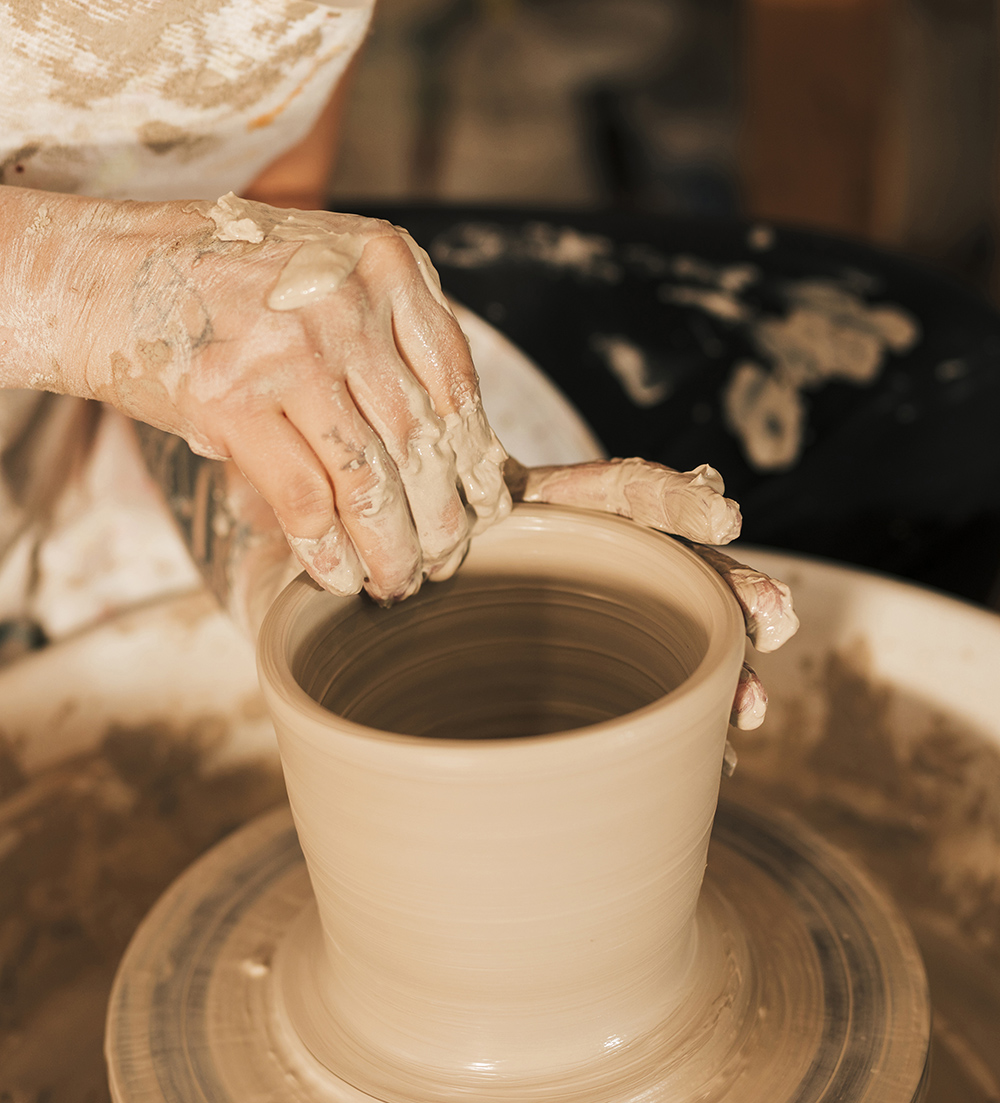 preparar y amasar la arcilla, entender la posición correcta del cuerpo y de las manos, centrar la pella y realizar los primeros movimientos fundamentales como abrir, subir y formar cilindros.