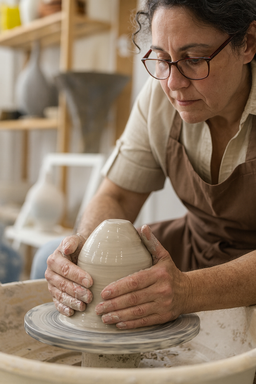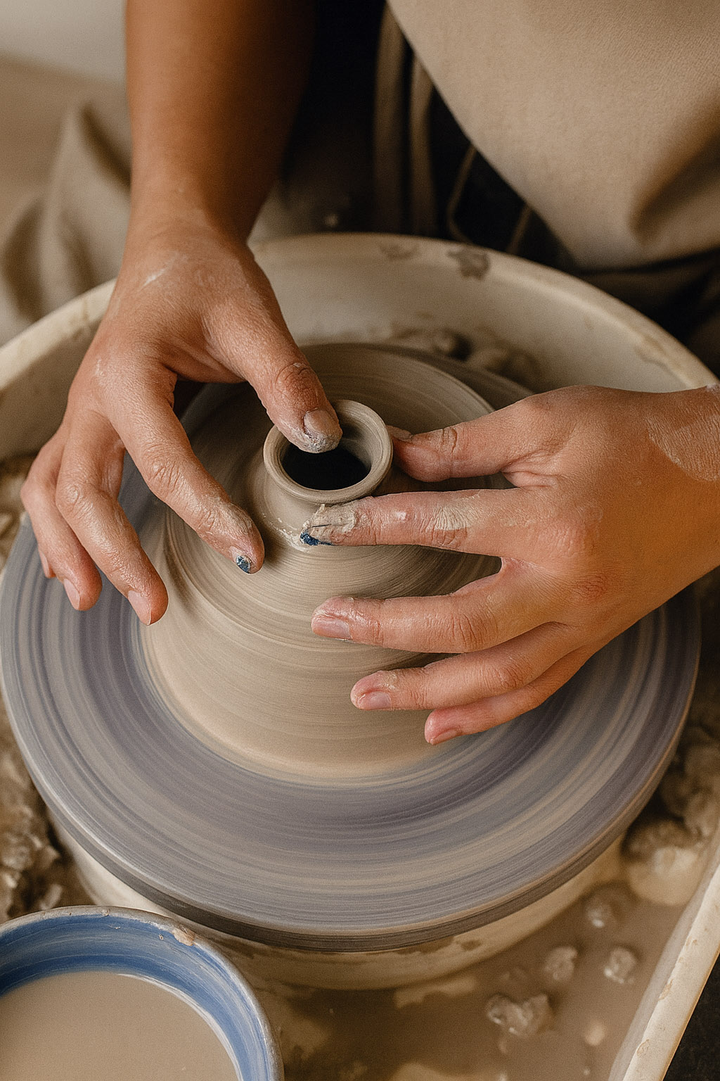 La experiencia del torno es sensorial: sentarte frente a la rueda, sentir el movimiento, aplicar presión y ver cómo el barro cambia de forma bajo tus manos. A través de ejercicios guiados irás comprendiendo cómo se comporta la arcilla, cómo interactúa con tu cuerpo y cómo pequeñas variaciones de gesto transforman por completo el resultado.