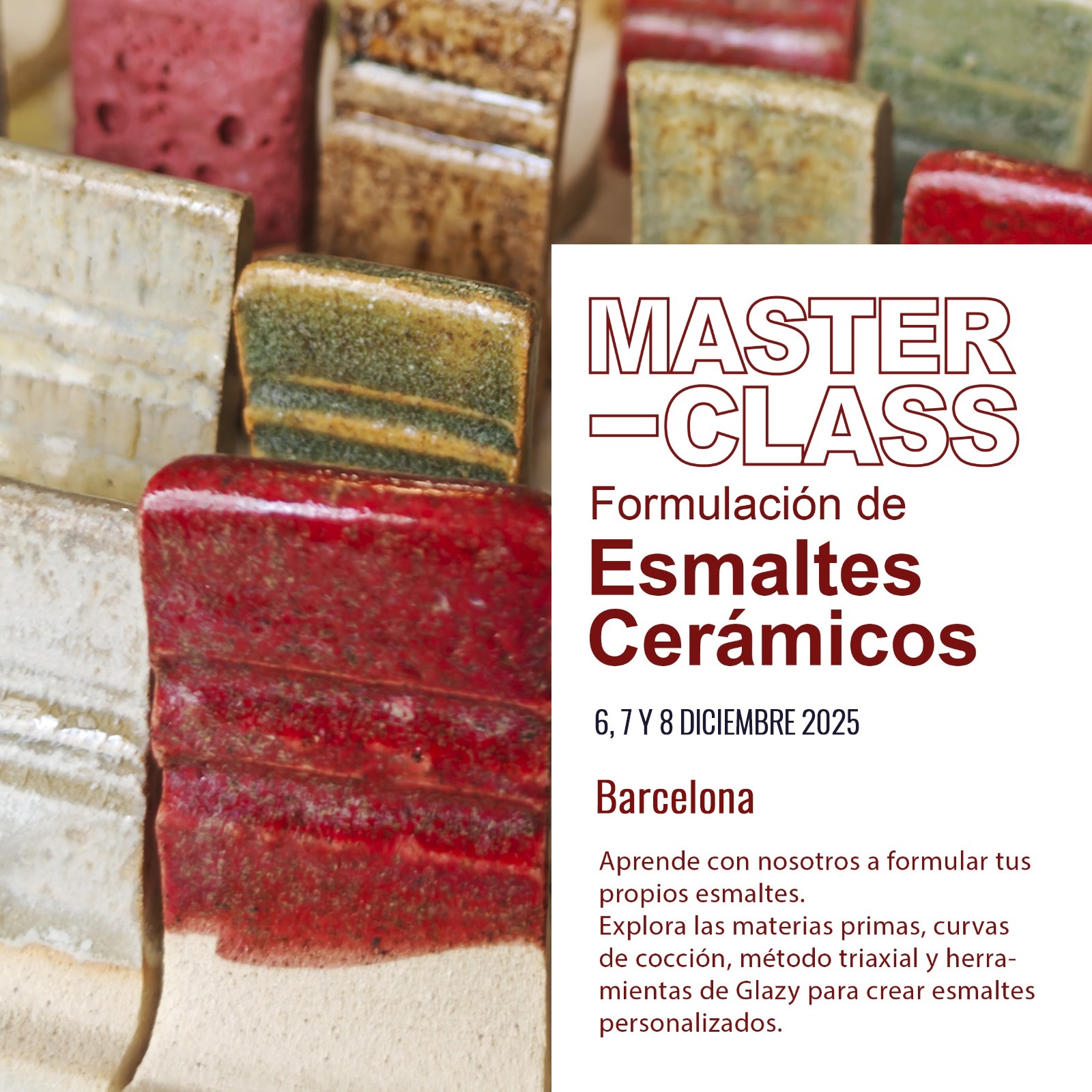 Este curso está diseñado para que aprendas a formular tus propios esmaltes cerámicos, comprendiendo su química y dominando todo el proceso, desde la teoría hasta la práctica. Durante el curso: Elaborarás diferentes tipos de esmaltes y pastas. Aprenderás técnicas de estabilización de esmaltes. Estudiarás los defectos más comunes en los esmaltes y cómo prevenirlos. Conocerás los criterios para formular esmaltes utilitarios de manera segura. Entenderás los aspectos clave sobre la toxicidad de algunos componentes en esmaltes.